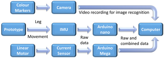 A laboratory experimental rig was used for the experiments, the layout of which is shown in Figure 4; the components are numbered as: (1) white screen; (2) two versions of the experiment, (2a) knee prototype mounted on a stationary rig, (2b) knee prototype attached to a volunteer; (3) IMU sensors attached to the prototype; (4) linear motor to force flexion/extension of the prototype; (5) video recording device; (6) energy consumption sensor; (7) colour markers to track movement after video processing.