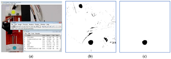 Image analysis—marker recognition: (a) the determination of the average RGB values of the colour of the marked (circle) area under investigation; (b) the recognition of multiple areas if the range of possible shades was too wide; (c) a correctly recognised marker with a defined range of colour shades (no other recognised elements).