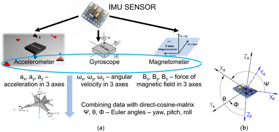 The used IMU sensor: (a) a schematic representation of the operating principle, the raw data collected and the combined data in the form of Euler angles; (b) the electronic element with a scheme of the measured Euler angles [12].