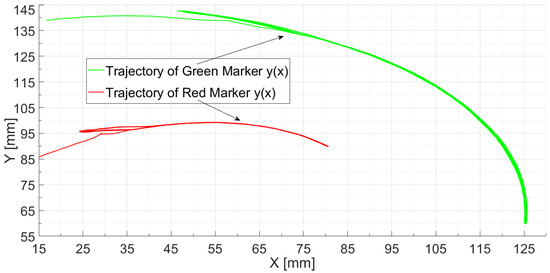 The trajectory of movement y(x) of the red and green markers—cam prototype [7].
