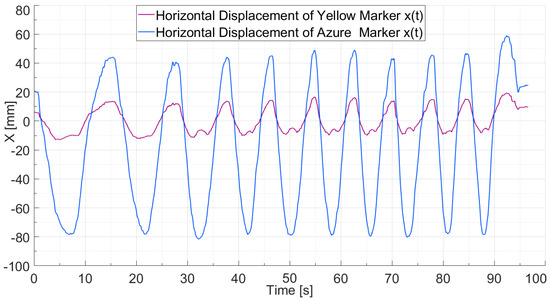 The data collected from the video analysis of the two colour markers, azure and yellow, placed on the femur of the dampers prototype (the tibia is immobile) are shown in Figure 11 and Figure 12. After the postprocessing described earlier, the movements of the markers were obtained and are presented, among others, as vertical displacements y(t) against time (Figure 11). The minimum/maximum values of the x and y positions of the markers obtained in successive repetitions are similar, with variation between repetitions not exceeding ±0.3 mm.