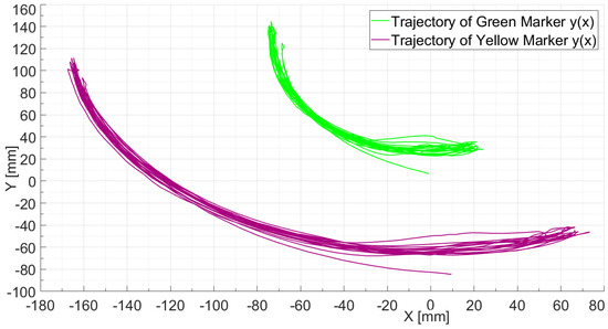 In addition, the diagrams of movement trajectories y(x) for the azure and yellow markers are presented for the dampers prototype (Figure 12). Similarly, the results of movements were obtained for the cam prototype and are presented as the trajectories of the red and green markers of the femur (Figure 13). For subsequent repetitions, the type of movement for both prototypes was maintained, which yields almost identical trajectory curves.
