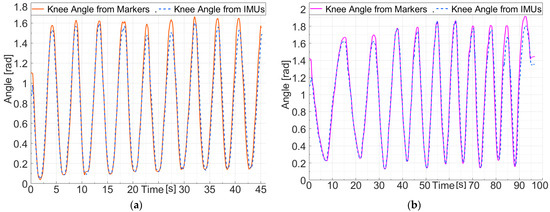 The flexion/extension angle of the knee joint in the sagittal plane determined by measuring the movement of the colour markers and IMU sensors: (a) cam prototype; (b) dampers prototype.