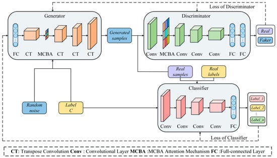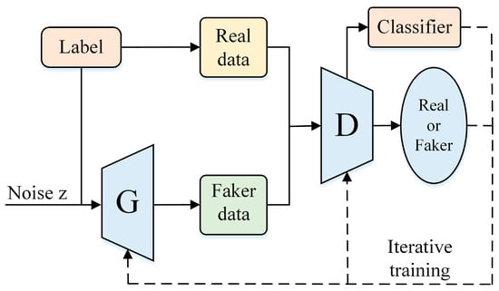ACGAN is an improved GAN that can be conditionally generated using class label information to generate samples with specified class characteristics. The discriminator improves the learning effect of the generator through confrontation and classification tasks []. Figure 1 shows the model structure of ACGAN, and the formula is as follows: