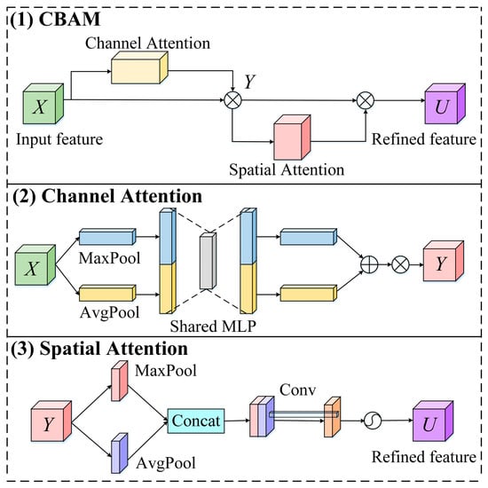 Convolutional block attention module (CBAM) improves the feature extraction process of convolutional neural networks by integrating channel attention mechanisms and spatial attention mechanisms []. Its structure is shown in Figure 2. Unlike traditional attention mechanisms that typically focus on a single dimension, CBAM constructs a sequential structure from the channel dimension to the spatial dimension, providing a comprehensive multi-dimensional enhancement of feature maps within convolutional neural networks. In the channel attention stage, the importance weight of each channel is obtained. By multiplying the original feature graph by channel, the dependence on the important channel is enhanced, and the influence of the weaker channel is reduced. In the spatial attention stage, the attention map is obtained, weighted, and fused with the original feature map, and the position with the higher response is highlighted to generate a new feature map. CBAM is as follows: