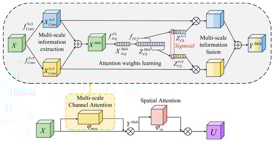 The traditional CBAM’s channel attention block overlooks features at different scales, and single-scale convolutional kernels are insufficient to capture diverse features, thereby limiting the model’s expressive capacity. At the same time, a select kernel network (SKN) can capture image information more comprehensively through a multi-scale convolution kernel for feature extraction []. However, the softmax function of SKN has the limitation of ignoring non-optimal features, and overreliance on a certain feature may occur in the case of data scarcity []. Therefore, this paper uses the sigmoid function instead of the softmax function to improve the feature extraction capability of SKN, and uses it to replace the channel attention block in CBAM. A multi-scale convolution block attention mechanism (MCBA) is proposed. The structure is shown in Figure 3. First, given any input feature map, multi-scale information is extracted through convolution operations with kernel sizes of 3 and 5, respectively: and . Secondly, in order to obtain the attention weight of multi-scale information, the features of different branches are combined: