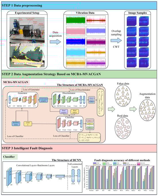 Overall flow chart of rotating machinery fault diagnosis method based on MCBA-MVACGAN.