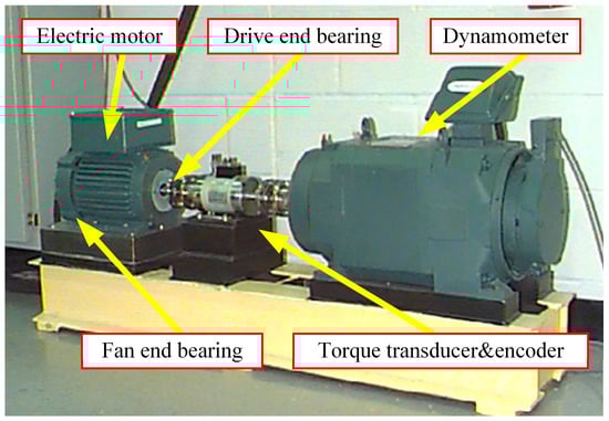 Dataset A: The Case Western Reserve University (CWRU) [] dataset collects vibration signals from rolling bearings under multiple working conditions and failure modes. The test stand is composed of a motor, a torque transducer/encoder, and a dynamometer. The testing bearings of the drive end and the fan end are SKF deep groove ball bearings: 6205-2RS JEM and 6203-2RS JEM. The experimental platform is shown in Figure 7. In order to simulate different faults, a single-point defect is created on the outer ring, inner ring, and roller of the bearing by means of EDM. The fault levels are 0.007, 0.014, 0.021, and 0.04. Each bearing was tested with four different loads (0, 1, 2, 3 hp) at a constant speed (approximately 1720–1797 r/min). In the process of data acquisition, the accelerometer is respectively installed at the 12 o’clock position of the fan end and the drive end of the motor housing to collect vibration signals. A 16-channel data logger was used to collect signals with sampling frequencies of 12 kHz and 48 kHz, respectively. Torque sensors/encoders are used to collect horsepower and speed data [].