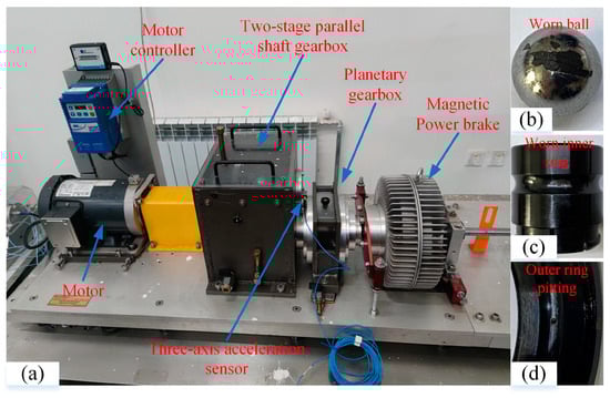 Parallel shaft gearbox experimental platform and faulty parts: (a) Experimental platform, (b) BF, (c) IF, (d) OF.