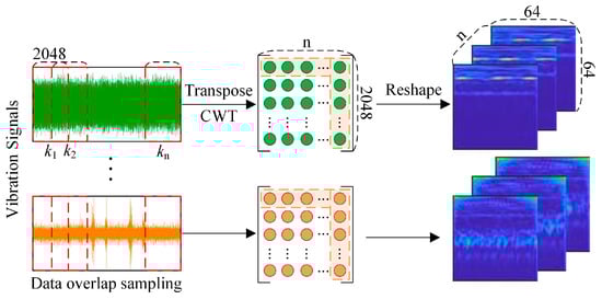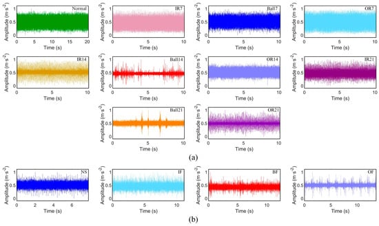 For every state of health, we adopted a sliding window to intercept non-overlapping vibration signals, selected 2048 points as sampling Windows, and randomly selected 120 samples. Finally, the time–frequency graph samples of each health state are obtained by continuous wavelet transform. The specific dataset partition is shown in Table 1. Figure 9 shows the time-domain waveform of dataset A and dataset B.