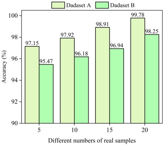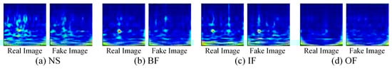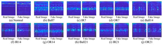 In order to visually show the similarity between true and false samples, this paper compares true and false samples of 10 health states in dataset A, as shown in Figure 18. A comparison of the true and false samples of four health states in dataset B is shown in Figure 19. The fake sample generated by MCBA-MVACGAN is highly similar to the real sample and can effectively generate important features of the real sample. Therefore, this method can realize effective fault diagnosis data enhancement.