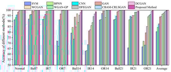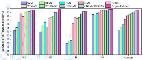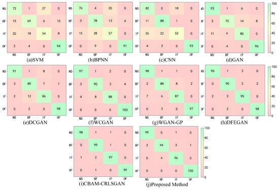 In order to visually reflect the quantitative analysis results of different methods in dataset B, Figure 17 visualizes using the confusion matrix. The diagonal section shows the correct classification of the sample size, and the non-diagonal section shows the sample size of misclassification. For SVM, BPNN, and CNN, it was clear that many samples were misclassified, with the IF being the most obvious, and the highest having only 57 correct predictions. Therefore, these three classification methods have great limitations when only a few real training samples are available. For all data enhancement methods, the correct predictions of BF and IF for GAN, DCGAN, and WCGAN were only 75 and 80 times, 89 and 86 times, and 88 and 87 times, which is unacceptable. Although WGAN-GP has 100 correct predictions, OF, BF, and IF have only 90 and 88 correct predictions. The correct prediction times of DFEGAN were 96, 95, 95, and 98 times, and the correct prediction times of CBAM-CRLSGAN were 99, 94, 96, and 100 times, respectively, and the correct prediction times of the method in this paper were 98, 99, 97, and 99 times, respectively. Obviously, compared with the advanced method DFEGAN, the proposed method can also be comprehensively superior to DFEGAN. Compared with the advanced method CBAM-CRLSGAN, the correct prediction times OF NS and OF are less than one time, but the correct prediction times of BF and IF are more than five times and one time respectively. Therefore, the comprehensive performance of the proposed method is stronger than that of CBAM-CRLSGAN, and it can achieve more accurate predictions. Table 7 shows the accuracy, recall, and F1-score of all comparison methods on dataset A and dataset B. The scores of the proposed method are 99.78%, 99.80%, 99.79%, 98.25%, 98.23%, and 98.24%, respectively, higher than those of the other nine methods, which verifies the superiority of the method in diagnostic performance.
