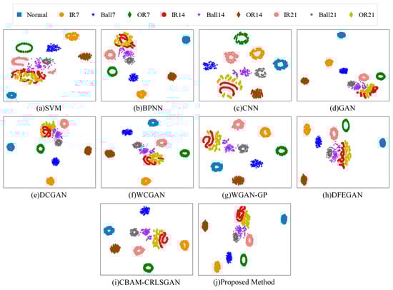 To visualize the ability of different methods to extract effective features, t-SNE [] was used to simplify the feature vector output of the last layer network work into two dimensions. Figure 16 is a visualization of the results on dataset A. In the figure, IR14 overlaps OR21 in all but the proposed method, DFEGAN, and CBAM-CRLSGAN. Compared with DFEGAN and CBAM-CRLSGAN, the proposed method has a better clustering effect on IR14 and OR21, and the overlap between Ball14 and Ball21 is minimal.