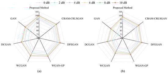 Diagnostic accuracies of various comparison methods under different SNRs: (a) CWRU, (b) SQI.