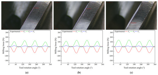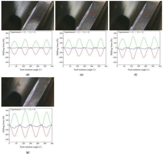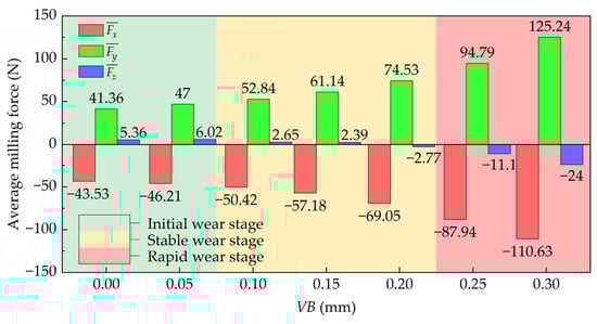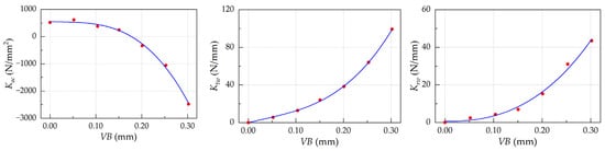- To visually demonstrate the variation in milling forces with tool wear during the milling process, we used Equation (13) to calculate the average milling forces in the XYZ directions from the coefficient-identification experiment. The results are presented in Figure 10. From these results, it is clear that tool wear leads to an increase in the ploughing-force coefficient, which subsequently leads to a progressive rise in milling force. When the tool reaches its end of life (VB = 0.3), the increase in cutting force can exceed 100% compared to when the tool is sharp. This observation is consistent with the findings of most previous studies. Both the milling-force and ploughing-force coefficient increase at an accelerating rate as the tool wears. This behavior aligns with the findings in the study by Liu et al. [24]. Furthermore, the tangential contact-force coefficient is much larger than the radial contact-force coefficient—approximately twice as large. This pattern agrees with the findings of Chen et al. [34]. Their study focused on milling TC4; due to the differences in material properties, their study found that the tangential contact-force coefficient was approximately three-times larger than the radial contact-force coefficient. Therefore, the model proposed in this study is deemed reliable, although variations in milling force due to tool wear may differ across various tools and materials.