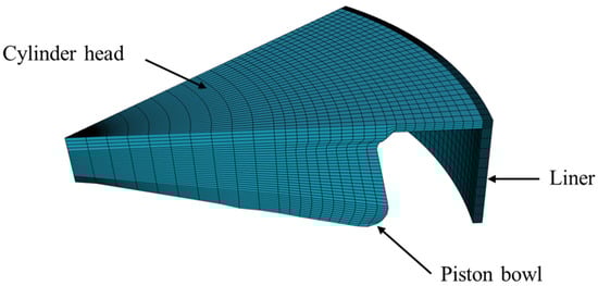 The CFD model was developed based on a single-cylinder, four-stroke compression-ignition engine. The engine speed was set to 1600 rpm for the simulation. The computational domain is represented in Figure 1. Only a 45° sector mesh was used. A mesh sensitivity analysis was performed to verify grid independence. The simulations started from the intake valve closing at 140 CAD BTDC and continued until the exhaust valve opening at 130 CAD ATDC, in order to capture the complete closed-cycle in-cylinder processes. This interval includes the compression, combustion, and expansion strokes, which are critical for accurately modeling ignition delay, flame development, heat release, and in-cylinder pressure evolution. Ending the simulation at the exhaust valve opening ensures that the effects of combustion completion and exhaust blowdown are fully captured. This, in turn, enhances the accuracy of predictions related to engine performance, thermal efficiency, and emission characteristics. The boundary and initial conditions applied are listed in Table 2. The in-cylinder pressure was obtained from experimental measurements, while the in-cylinder gas temperature was assumed to be equal to the cylinder wall temperature due to the absence of experimental in-cylinder temperature at IVC. Other initial and boundary conditions were selected based on values commonly reported in previous studies.