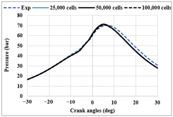Figure 3 illustrates the effect of mesh resolution on the simulated in-cylinder pressure as a function of crank angle, compared with experimental data at HSR 50. The results show that the pressure profiles obtained with all three mesh sizes are very similar, with each case accurately reproducing the experimental trend. Although the 100,000-cell mesh showed slightly better resolution, the improvement was marginal compared with the 50,000-cell mesh, justifying the computational efficiency trade-off. The negligible variation between simulated curves confirms that the model is effectively independent of mesh size within the examined range. This finding indicates that the use of finer meshes does not yield any significant improvement in accuracy and only increases computational cost. Consequently, the mesh with 50,000 cells was selected as it provides an optimal balance between computational cost and numerical accuracy.