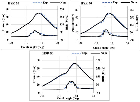 Figure 5a illustrates the impact of HSR on ignition delay, comparing both experimental and numerical results. A non-linear correlation is observed between the ignition delay and HSR. The ignition delay increases from HSR 50 to HSR 70, reaching a maximum at HSR 70, before decreasing at HSR 90. At HSR 70, the experimental ignition delay is longer because the pilot injection of the diesel fails to ignite, as shown by the experimental HRR curve (Figure 4). In contrast, the numerical model predicts a slightly shorter ignition delay at HSR 70, because the pilot diesel ignites in the simulation, as indicated by the numerical HRR (Figure 4). Notably, the numerical and experimental ignition delays match closely at HSR 50 and 90. This discrepancy at HSR 70 may arise from complexities in the transition from diesel-dominated to hydrogen-assisted ignition that are not fully captured by the model, or from differences in the physicochemical properties of the modeled diesel fuel and the diesel used experimentally. At HSR 90, a shorter ignition delay was observed. This behavior is primarily driven by the increased hydrogen content in the heptane mixture, which enhances the reactivity of the fuel-air mixture [36]. The presence of hydrogen, known for its exceptionally low ignition energy [60], promotes earlier auto-ignition, thereby accelerating the combustion process. As a result, the ignition delay is reduced compared with cases with lower hydrogen substitution.