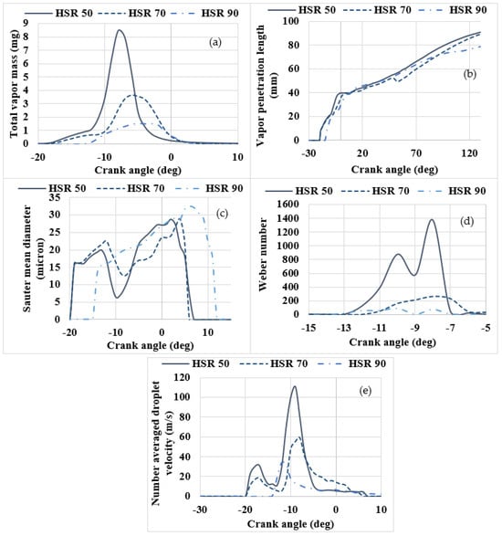 The droplet velocity profile, presented in Figure 7e, peaks approximately in the same region as the vapor mass (~10° CA), with HSR 50 showing the highest velocity. This supports the higher Weber number at HSR 50. As HSR increases, droplet velocity decreases, indicating lower momentum due to the lower injected fuel mass.