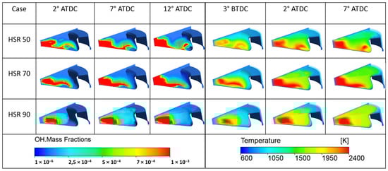 Figure 8 presents the evolution of OH mass fraction and temperature distribution at three crank angles for different HSRs. The spray controls the onset of combustion in all three HSR configurations. This behavior confirms that, even under dual-fuel operation, the pilot fuel governs the initial flame development, in agreement with Zou et al. [64]. At HSR 50 (2–12 CAD ATDC), OH radicals form within the spray plume, initially appearing near the nozzle and progressively extending toward the cylinder wall. As HSR increases from 70 to 90, the highest OH concentration remains localized near the nozzle region along the piston bowl wall. This high-reactivity zone is surrounded by a lower-concentration OH region that expands more broadly, covering almost the entire cylinder area at 12 CAD ATDC. The highest OH concentration corresponds to the reaction zones, which are typically associated with fuel-rich regions. The observed OH reduction in these zones is attributed to the lower diesel content resulting from increased hydrogen substitution.