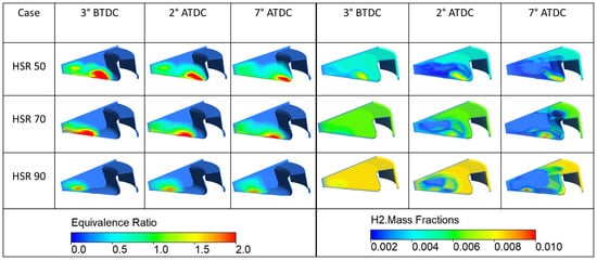 This trend is further confirmed by equivalence ratio contours (Figure 9), which show that rich regions initially form near the cylinder walls as the diesel penetrates and reaches them. This behavior is supported by the droplet velocity curves, which show the highest velocity at HSR 50, gradually decreasing as HSR increases. At HSR 90, the rich region is primarily observed near the nozzle, as the reduced diesel quantity and lower droplet velocity prevent the spray from reaching the cylinder walls. In all cases, the fuel-rich zones are followed by stoichiometric regions, indicating effective mixing between the fuels and the surrounding air. In contrast, the lower-concentration OH regions become more uniform and are primarily governed by the presence of hydrogen, as depicted in Figure 9. This behavior stems from hydrogen’s higher diffusivity and faster flame speed, which enhance combustion reactions and promote faster and more homogeneous flame propagation. Furthermore, the temperature maps align closely with the OH regions, confirming that early heat release arises from pilot-fuel radicals (Figure 8). At HSR 50, the high temperature region tends to extend toward the cylinder walls, whereas at HSR 90, it shifts toward the piston bowl wall. These observations are consistent with the findings of Zhang et al. [65], who reported similar temperature distribution patterns under varying hydrogen substitution levels. HSR 50 and HSR 70 produce intense and localized hot regions (≈2400 K) with sharp temperature gradients that accelerate flame propagation. In contrast, HSR 90 produces a broader and less intense temperature peak (≈1600–2000 K) and a larger reaction zone, leading to more distributed combustion. Similar findings were reported by Leng et al. [66], who investigated the effects of hydrogen enrichment on the combustion and emission characteristics of a turbulent jet ignited medium speed natural gas engine in a numerical study. The temperature contours showed that as the hydrogen content increases, high-temperature regions expand throughout the cylinder.
