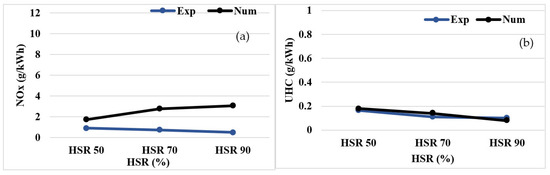 Hydrogen substitution in diesel combustion enhances flame propagation speed and raises the adiabatic flame temperature, both of which significantly influence emissions formation. Figure 10 presents the variation of NOx and UHC emissions for different hydrogen substitution ratios. Nitrogen oxides (NOx) formed during combustion are primarily composed of nitric oxide (NO) and nitrogen dioxide (NO2), with NO typically accounting for 90–95% and NO2 for 5–10% [67]. NOx formations are strongly influenced by the in-cylinder temperature [40]. As the HSR increases from 50 to 90, NOx emissions rise (Figure 10a). The observed increase in NOx emissions is primarily driven by the elevated adiabatic flame temperature of hydrogen [41]. This trend has been observed in previous works [68,69,70]. Experimentally, Exhaust Gas Recirculation (EGR) was strategically increased at higher HSRs to effectively reduce NOx emissions by lowering the oxygen concentration and peak flame temperature. The discrepancy between simulated and experimental NOx values stems from the simplified assumption of a spatially uniform EGR distribution in simulations, whereas the experiments involve a stratified EGR configuration. This modeling simplification leads to a consistent overprediction of numerical NOx emissions at higher hydrogen substitution levels.