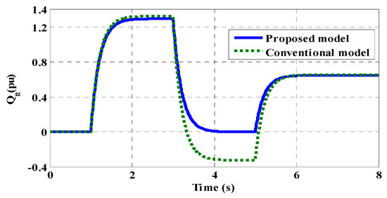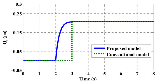 Adjustments regarding references of reactive power for both the stator and the GSC are being examined. Specifically, the combination of active and reactive power references is initially established at zero. All along , the stator reactive power reference gets 0.2 pu and at time instant , that supposes valuation at −0.1 pu. Alternatively, the reactive power is exchanged between the GSC and the grid becomes 0.2.5 pu, at that time 2.5 s, and −0.01 pu at that time 4 s. Additionally, Figure 7 and Figure 8 illustrate the feedback of the stator flux elements. The assumptions made regarding the stator flux components regarding speed control of the rotor apply to the studied operations, although a near stator-flux orientation has been successfully attained. It is clear from Equation (35) that the stator power expression in Equation (29) concerning the closed-loop control system, is connected directly with and is connected directly with , which can also be verified by inspecting Figure 7 and Figure 8.