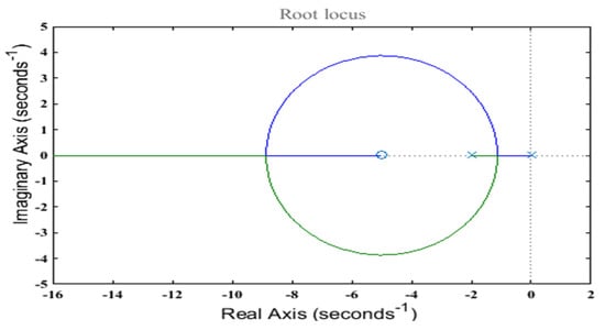 This is evident from (44) that the behavior of the closed loop may be altered with the criterion , which shows that the design of the controller has to be followed along a generalized root locus of the nonlinear system with changing criterion , so for steady-state operation, this complete anticipated performance scope of the PMSG system is achieved. Since is anticipated to stay in a calculated domain of values. The root locus evaluation gives a recognized significant range for the dominant pole of (44) that is to be related to the expected settling time . Moreover, during the expression of the parameter , a suitable value for the integral gain can be chosen, although the value of is resolved from (43), which provides the required settling time and the damping factor.