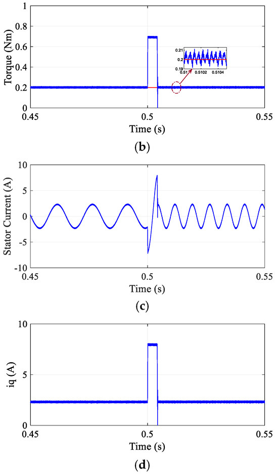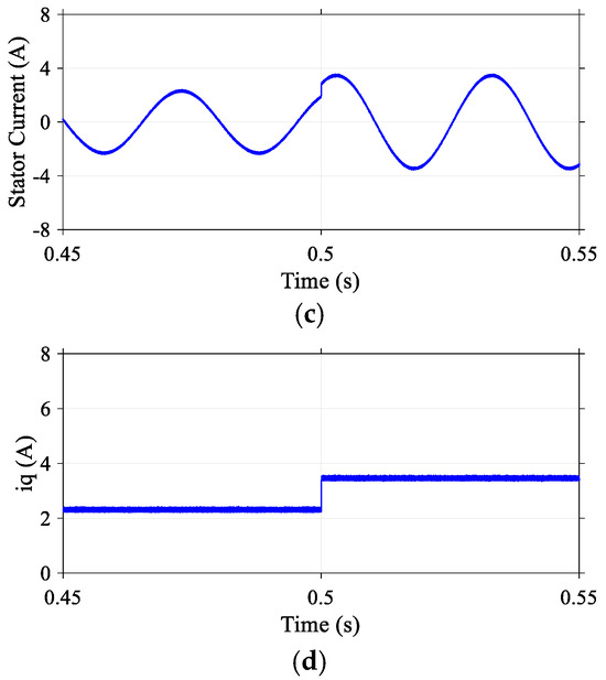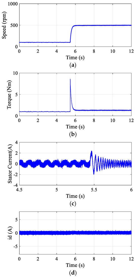 Transient response of proposed DR-MPDSC under a step change in load torque at a constant speed of 500 rpm. (a) Speed. (b) Torque. (c) Stator current. (d) Quadrature-axis current.