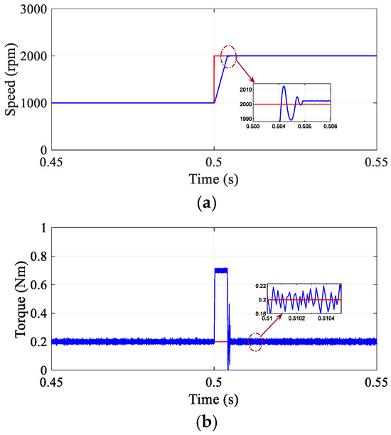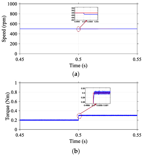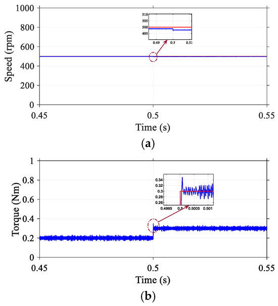 Simulation experiments were carried out to assess the effectiveness of the proposed DR-MPDSC strategy when subjected to sudden variations in load torque on a Permanent Magnet Synchronous Motor (PMSM). To evaluate the controller’s disturbance rejection capabilities, a step load torque disturbance was introduced during steady-state conditions. The results, illustrated in Figure 5, indicate that the DR-MPDSC method successfully sustains precise and stable speed regulation in the presence of abrupt external disturbances. Specifically, the DR-MPDSC achieved a steady-state speed offset of just 0.005% and maintained torque ripples at just 0.0165 Nm, demonstrating excellent dynamic performance. In comparison, the conventional FOC method (Figure 6) exhibited a steady-state speed offset of 1.45% and torque ripples of 0.0855 Nm, while the MPDSC approach (Figure 7) yielded a steady-state speed offset of 0.06% but suffered from substantially higher torque ripples of 0.032 Nm. The system’s speed response with DR-MPDSC displayed only minor deviations and achieved rapid recovery, underscoring the predictive controller’s robustness and responsiveness.
