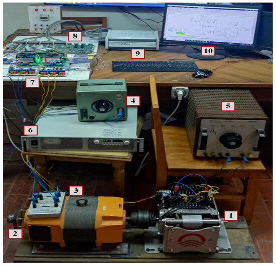 Hardware components of the experimental setup. (1) PMSM, the primary motor under testing whose parameters are listed in Table 3. (2) Encoder. (3) DC generator. (4) Generator excitation. (5) Loading variable resistance. (6) Programmable DC supply. (7) IGBT-based inverter. (8) Interface board. (9) dSPACE 1202 MicroLabBox. (10) Host PC.