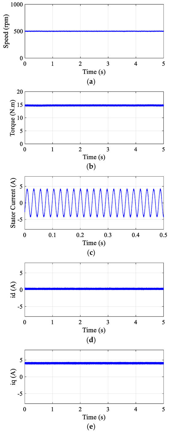 Steady-state experimental response of the proposed DR-MPDSC method at a constant speed of 500 rpm. (a) Speed. (b) Torque. (c) Stator current. (d) Direct-axis current. (e) Quadrature-axis current.