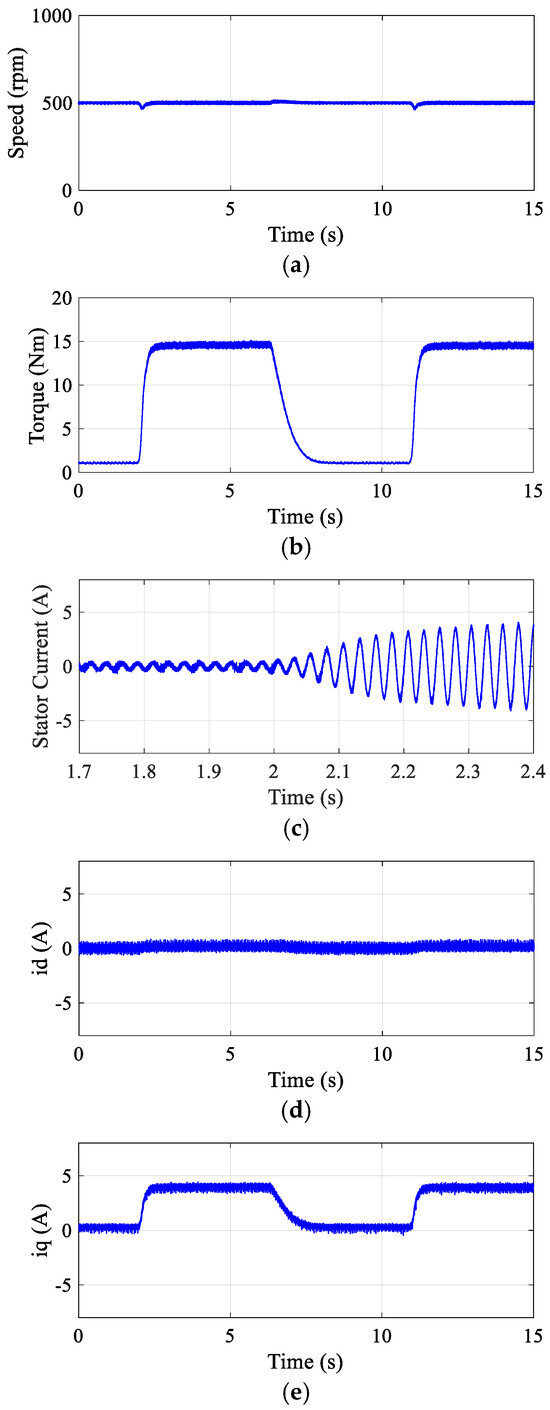 Experimental transient response of the proposed DR-MPDSC under step load torque variation at a constant speed of 500 rpm. (a) Speed. (b) Torque. (c) Stator current. (d) Direct-axis current. (e) Quadrature-axis current.