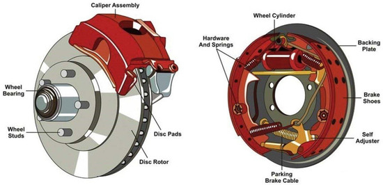 The main components of disc and drum brakes, existing on the first Dacia Logan cars. https://www.spinny.com/blog/drum-brakes-vs-disc-brakes/ (accessed on 20 September 2025).