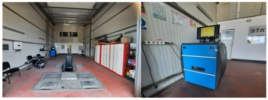 The composition and elements of the braking system with different types of brakes on the two axles and the appearance of a Dacia Logan, model 2025 are presented in Figure 2a,b and Figure 3 shows the interior an periodic technical inspection station.