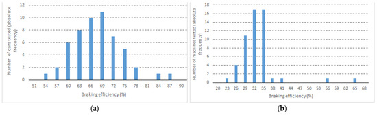 Frequency distribution of tested cars according to braking efficiency. (a) Service brake; (b) emergency brake.