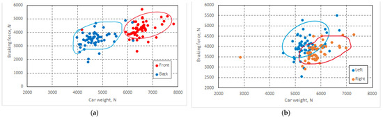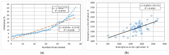 At the same time, we also analyzed the imbalance of braking forces on the front axle for the car group tested (Figure 7a), as well as the same imbalance for the left wheel in relation to the braking force on the right wheel (Figure 7b). The same imbalance of braking forces was also analyzed for the rear axle of the car (Figure 8a,b).