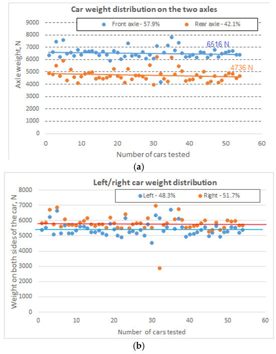 Weight distribution of the cars on the two front–rear axles (a) and on the two sides (b), for the Dacia-Logan cars tested.