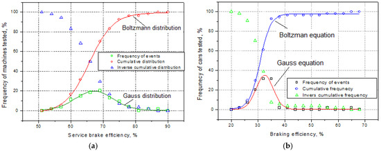 For the theoretical analysis of the efficiency of the two braking systems, the distributions of the values, both relative and cumulative, were graphically represented, as shown in the charts from Figure 11a,b, after the data had been previously processed for such an analysis. The analysis was performed in the MicroCall OriginPro program, vers. 7 [22,23]. For the relative distribution of the percentage of cars by efficiency values, the Gauss model was used [22], which has the relationship presented below (8), and for the cumulative distribution, the Boltzmann model was used with the relationship shown in (9), as presented by the Microcall Origin program: