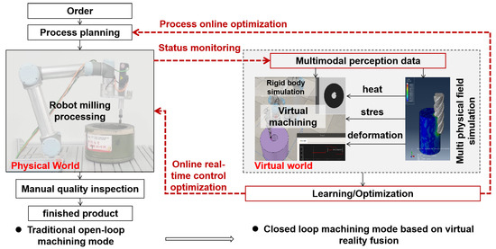 The existing precision manufacturing mode mainly relies on CNC machine tools or robots for machining, as shown on the left side of Figure 1. The robot only processes based on the trajectory planning results, which is equivalent to an open-loop control process. The present study introduces an innovative framework that systematically bridges physical and virtual domains for robotic milling applications.
