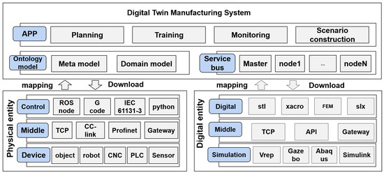 The DTMS is based on the modeling specification of the metamodel, including the ontology model layer, service bus layer, and application layer, unifying physical entities and virtual entities into the ontology space, and building a system running environment of virtual and real integration through service association. In the DTMS, the service bus is mainly based on the ROS environment, and the ontology model and the application development based on the ontology model are the core of realizing virtual and real integration of the system, which is also the main work of this paper, which will be discussed in detail in the subsequent sections.