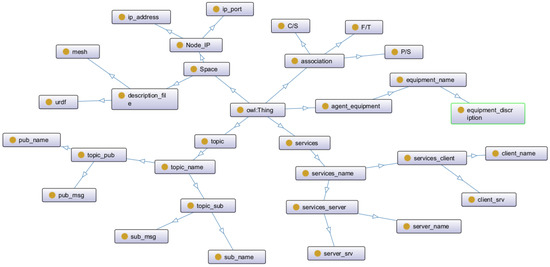Figure 4 includes five other elements, used for the characterization of a complete collaborative simulation scenario. The agent in Figure 4 includes three elements: space, service, and topic. The connection between Agent1 and Agent2 is topic, service, and space, characterizing the information interaction, service call, and spatial location relationships between agents, respectively. The specific functions of the agent are released through the service method, and the workflow of the service can represent the specific processing process. Semantic description of the model was conducted using the OWL language. Specifically, Protege software was employed to encapsulate the model, and the ontology of the robot shaping system was formalized by defining classes and their attributes. Through this process, the concepts defined in the GASSTA model could be transformed into OWL classes. The data properties of the classes can be used to correlate specific 3D models, program code, text, formulas, and other knowledge information to provide support for the subsequent collaborative simulation code generation.