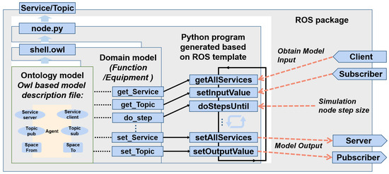 Code generation is central to the development of the DTMS presented in this paper. Application layer design tools for the agent, services, topics, spaces, and other properties in the virtual environment are used to reconstruct the virtual scene. This paper uses the features of distributed deployment in the ROS architecture. Using the ROS code generation principle shown in Figure 7, the ontology model contains instance information in ROS function package-required files and programs.