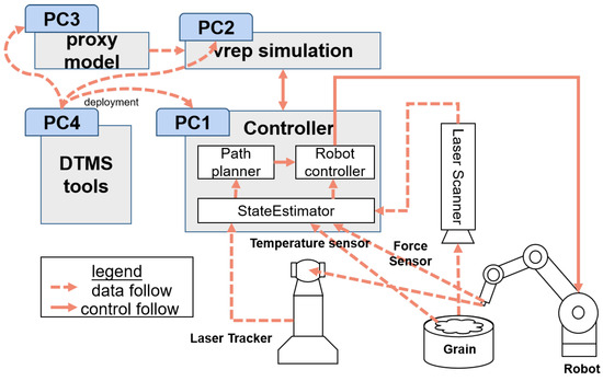 In [17], vision-based control for disassembly tasks utilizes CAD and vision data to inform task planning, illustrating how geometric information can be integrated to improve precision and adaptability. The simulation of the robotic operation tasks is implemented in a digital environment. The ROS-based packaging tool developed by Vazirpanah aims to integrate heterogeneous models built in different simulation environments into a unified formal heterogeneous modeling framework [18]. The interaction between models is through topics, but the real-time correlation and scheduling between systems cannot be guaranteed. A cognitive twin architecture is designed to construct different domain models into a unified semantic ontology model and automatically transform them into an FMI model to realize a digital twin simulation of a complex system [19]. Although these cases provide some useful simulation models or architectures, there are still some challenges in the practical application of digital twinning and AI technology [14,20].