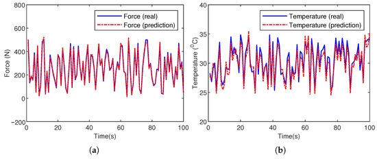 Physical experiment verification of a digital twin system for inert solid propellant grain cutting. (a) Temperature measurement values and predicted values during the shaping process. (b) Force measurement values and predicted values during the shaping process.