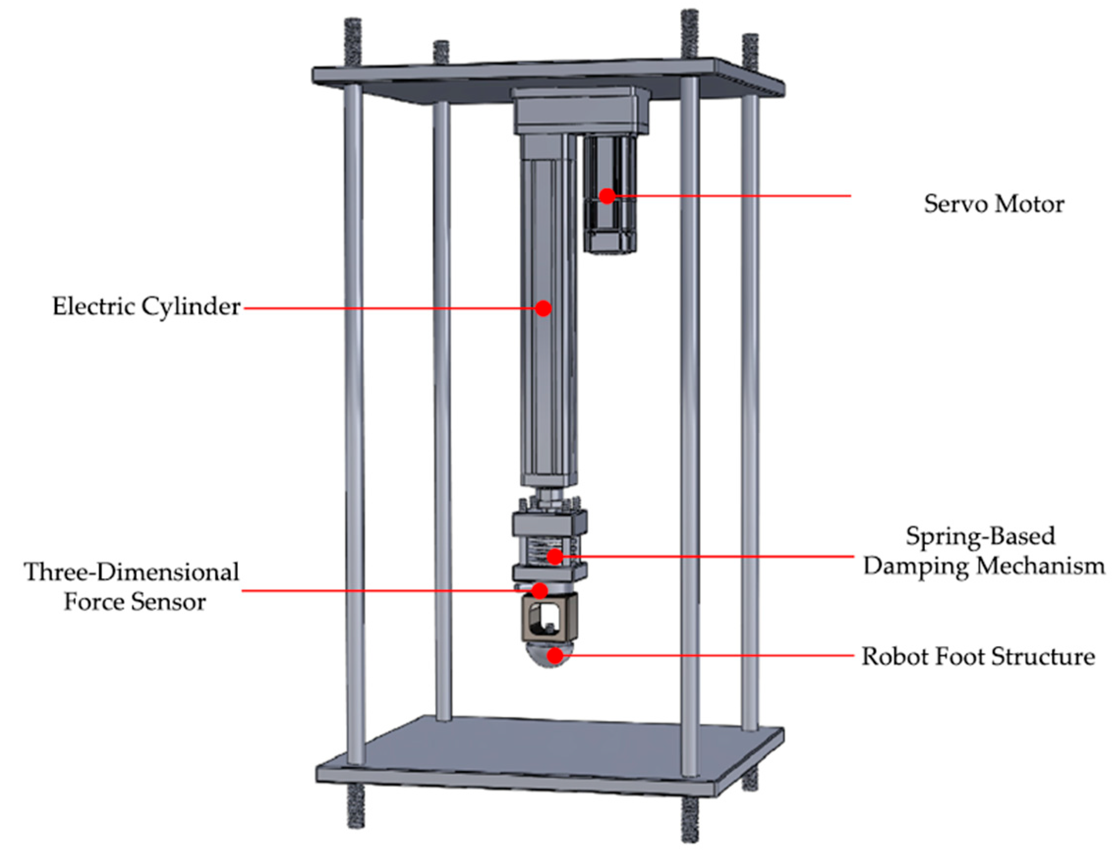 The spring-based damping mechanism is installed between the electric cylinder and the three-dimensional force sensor to provide a certain buffer stroke during high-intensity impacts, preventing damage to the sensor caused by rigid collisions. The three-dimensional force sensor is mounted between the spring mechanism and the robot foot, enabling real-time measurement of force variations along the X, Y, and Z axes of the foot. The terminal component of the system is the simulated robotic foot.