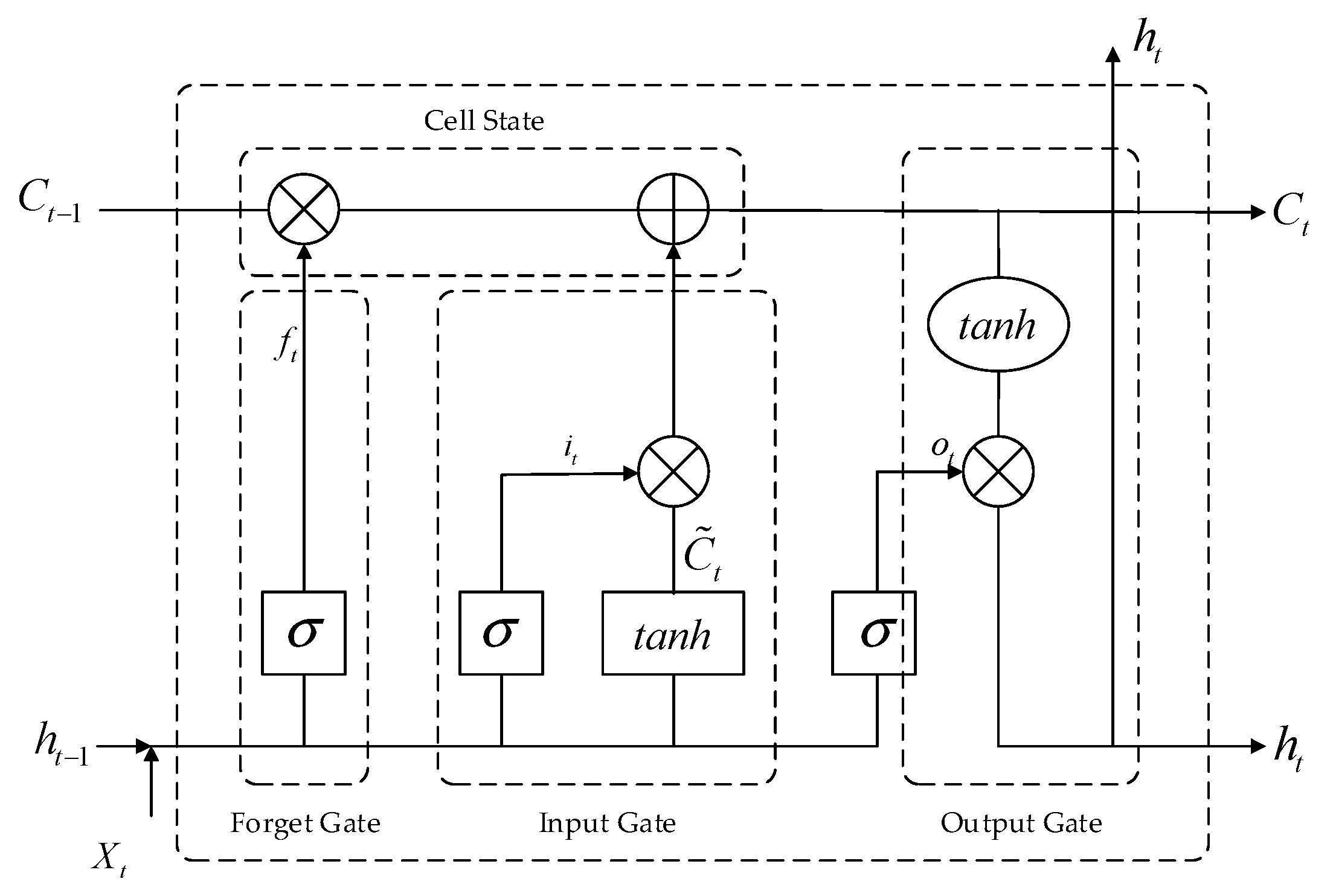 As a special type of recurrent neural network (RNN), the long short-term memory (LSTM) network addresses the vanishing and exploding gradient problems commonly encountered in conventional RNNs when learning long sequences by introducing a gating mechanism. Its internal architecture comprises three primary gates—the forget gate, input gate, and output gate—which dynamically regulate the transmission and update of information within the cell state. The interactions among these gates within an LSTM unit are illustrated in