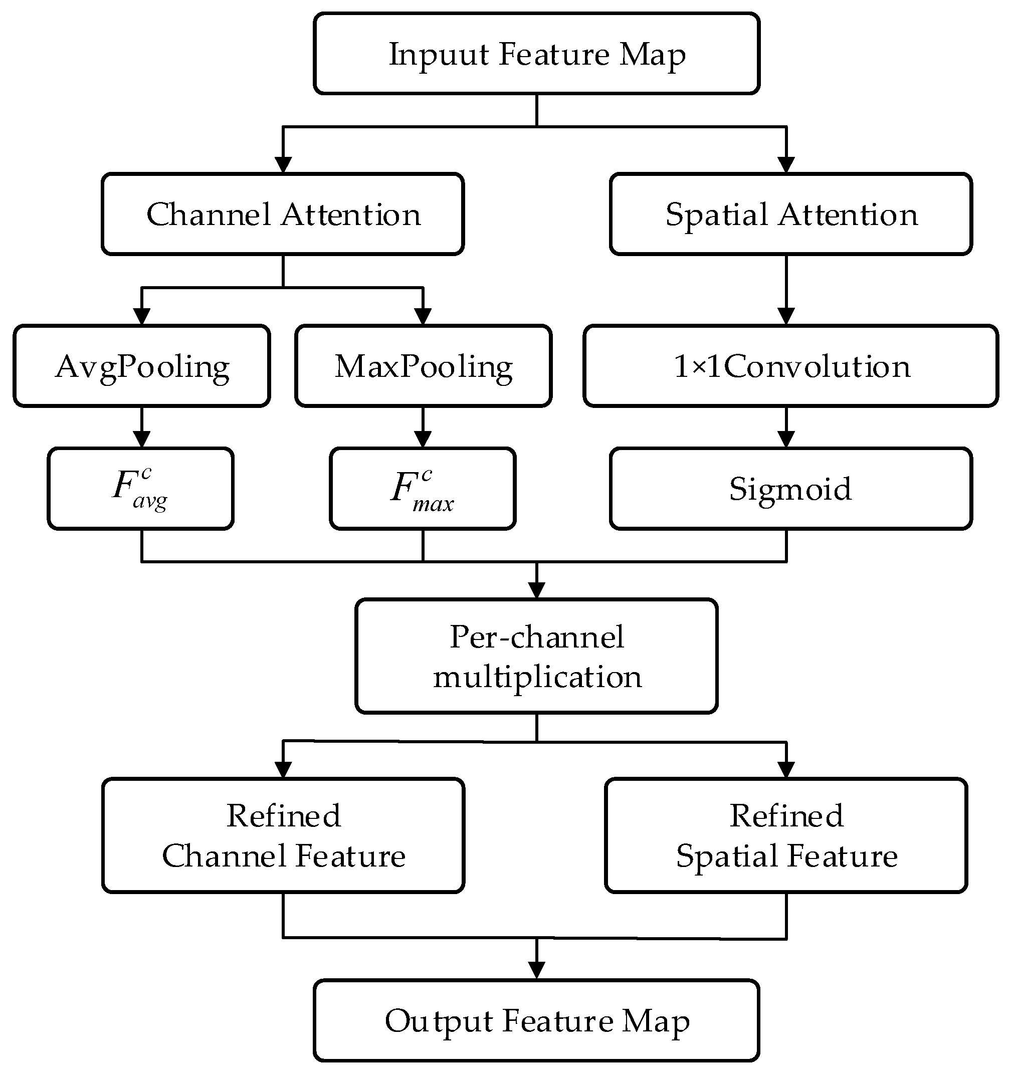 Then, the two descriptor vectors are fed into a shared multi-layer perceptron (MLP), summed, and passed through a sigmoid activation function to obtain the channel attention weight. The formula is as follows:
