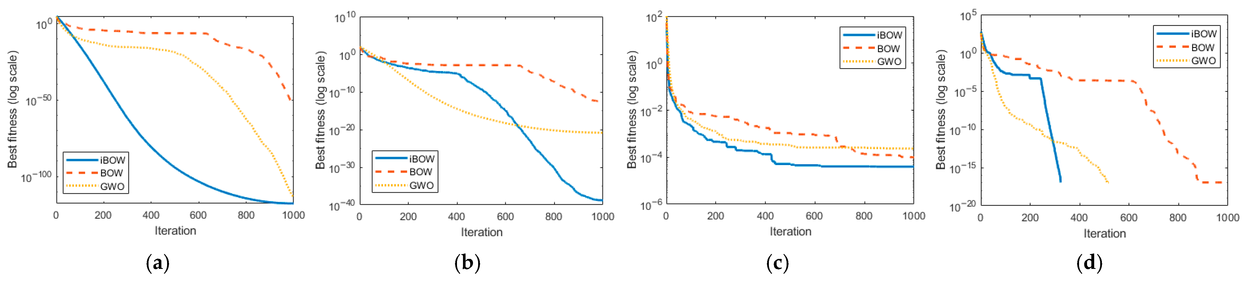 To evaluate the improvement of the proposed IBWOA, a comparative study was conducted against BWOA and GWO. The benchmark functions were selected from the standard CEC2005 test suite released by the IEEE Congress on Evolutionary Computation, where four representative functions (F2, F4, F7, and F11) were chosen for evaluation. The experimental settings were as follows: the maximum number of iterations was set to , the population size was , and each function was independently executed 10 times, with the final fitness values reported as the mean over all runs.