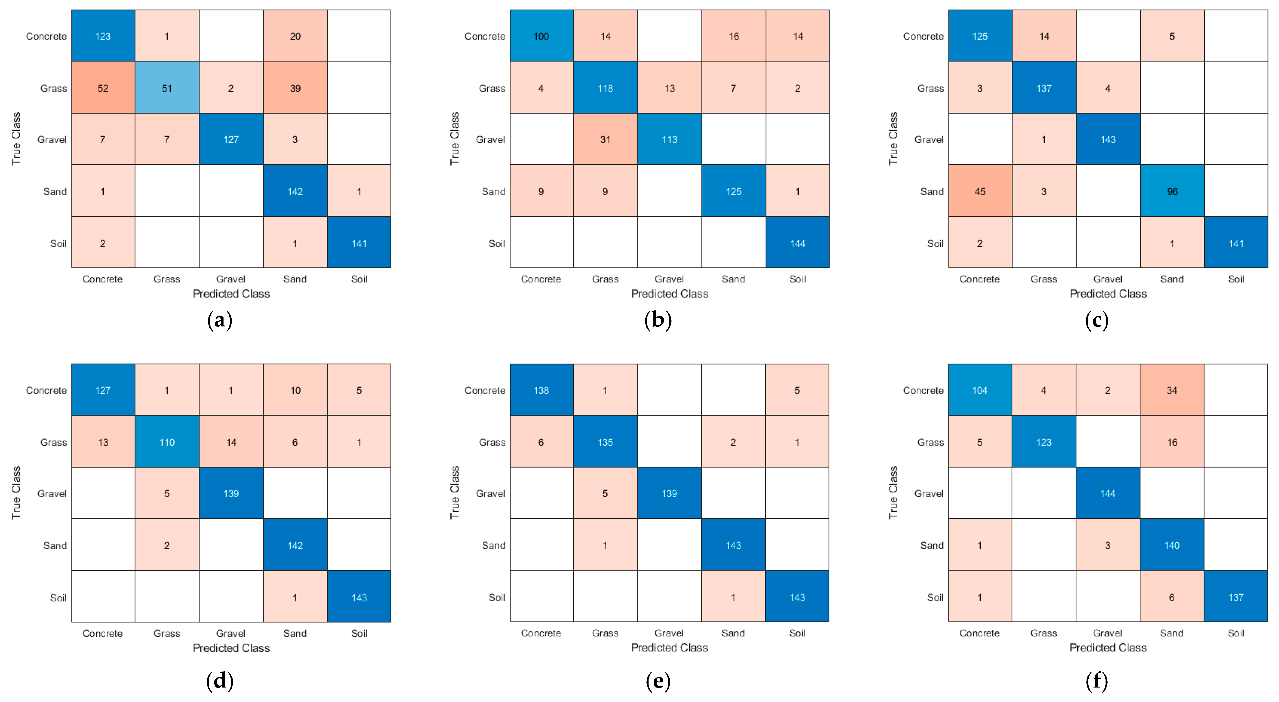 14] (2023) classified wheel–terrain interactions based on vibration signals, achieving 92.36%. Sarcevic et al. [